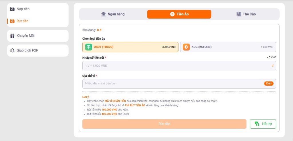• Rút tối thiểu 100.000 VNĐ cho KDG.